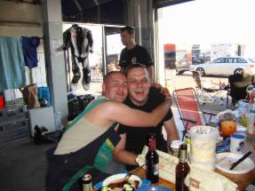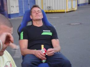 Tappte das Team am Freitag noch etwas im Dunkeln, erhellten sich die Minen am Samstag doch deutlich. Denn die Umsetzung der Freitags-Idee ermöglichte es Dirk, wieder bessere Zeiten zu fahren. Aber am Ende des zweiten Trainingstages sanken nicht nur die Rundenzeiten, nein, auch der Flüssigkeitsstand bei den Fahrern. Zwecks Regeneration reichte nun nicht nur der Besuch eines nachbarlichen (aufblasbaren) Swimmingpools, es musste auch viel Flüssigkeit zu sich genommen werden. Ein Indiz für die enorme Belastung der Fahrer war, dass es an diesem Wochenende doch häufiger als sonst zu bisweilen auch schwereren Stürzen kam. Alle waren also gewarnt, besonders auf sich zu achten.