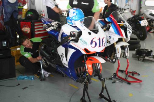 Da auch Yasin ein sehr redlicher und disziplinierter Aufzynder ist, lief auch der Sonntag recht reibungslos ab – auch unter tatkäftiger und rührender Mithilfe von Yasins Vater Sahin. Das Training lief gut und das Team stand auf Startplatz 26. Leider konnte das nicht jeder sagen, denn unser Freund Oli Exner hatte mit einem kapitalen Highsider zum Abbruch des zweiten Trainings beigetragen. Da Andree bis zum Rennen nicht unsere voll Aufmerksamkeit benötigte, halfen Dirk und Chris bei der Reparatur von Olis Motorrad. Zwar recht zerfleddert, aber immerhin haben die vielen helfenden Hände das Motorrad später wieder an den Start gebracht und ihm in der Endabrechnung den Sieg in der ADAC Conti Endurance Challenge ermöglicht.